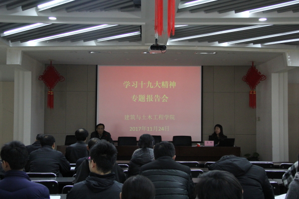 11月24日下午,建工学院在博学馆A座五层会议室开展学习十九大精神专题讲座。按照校党委《欧博abg官网登入口关于做好学习贯彻党的十九大精神宣讲工作的通知》要求,邀请学院宣讲团第二组组长、经济管理学院党委副书记李玮为全体教职工做了题为《十九大精神——实现伟大梦想的政治宣言和行动纲领》的讲座,讲座由院党委书记周伟主持。