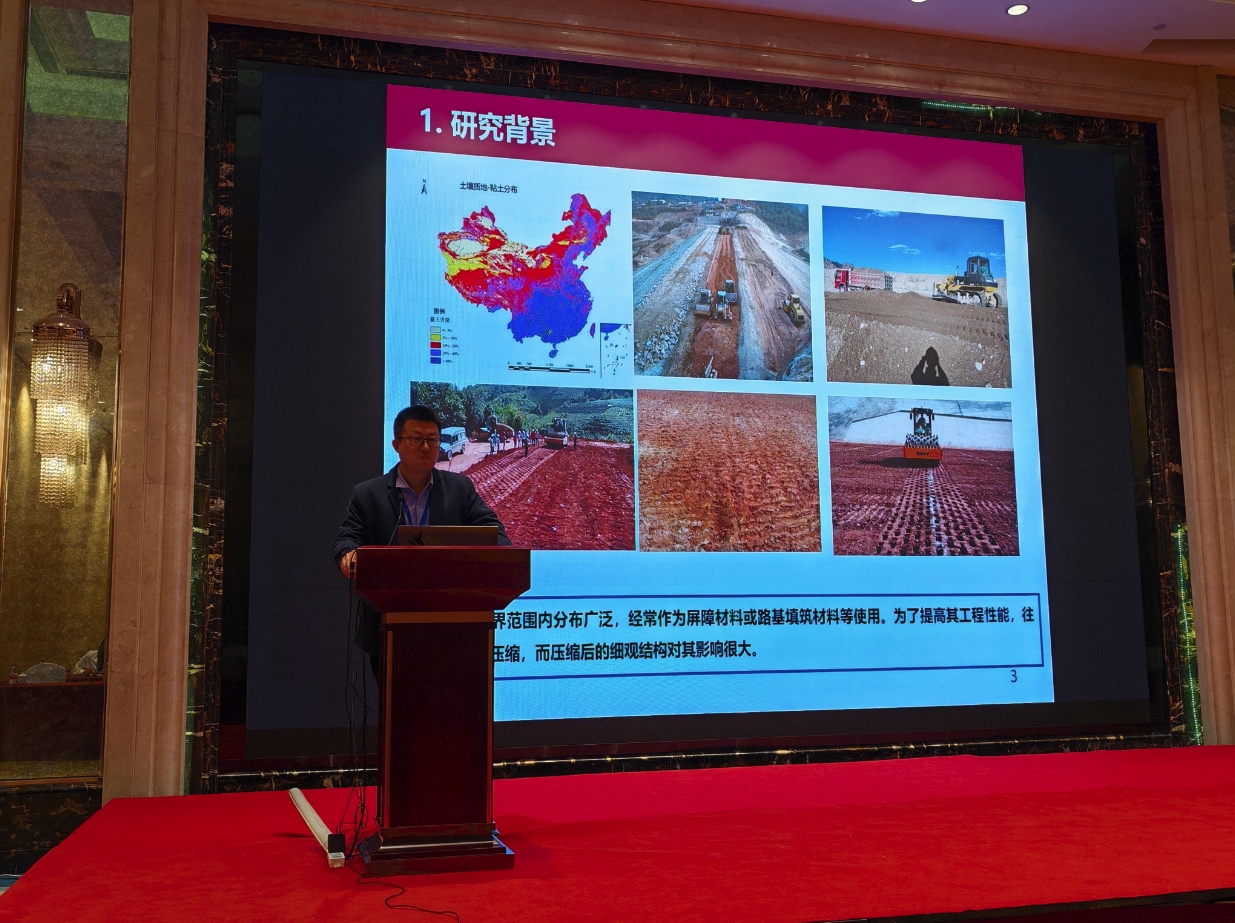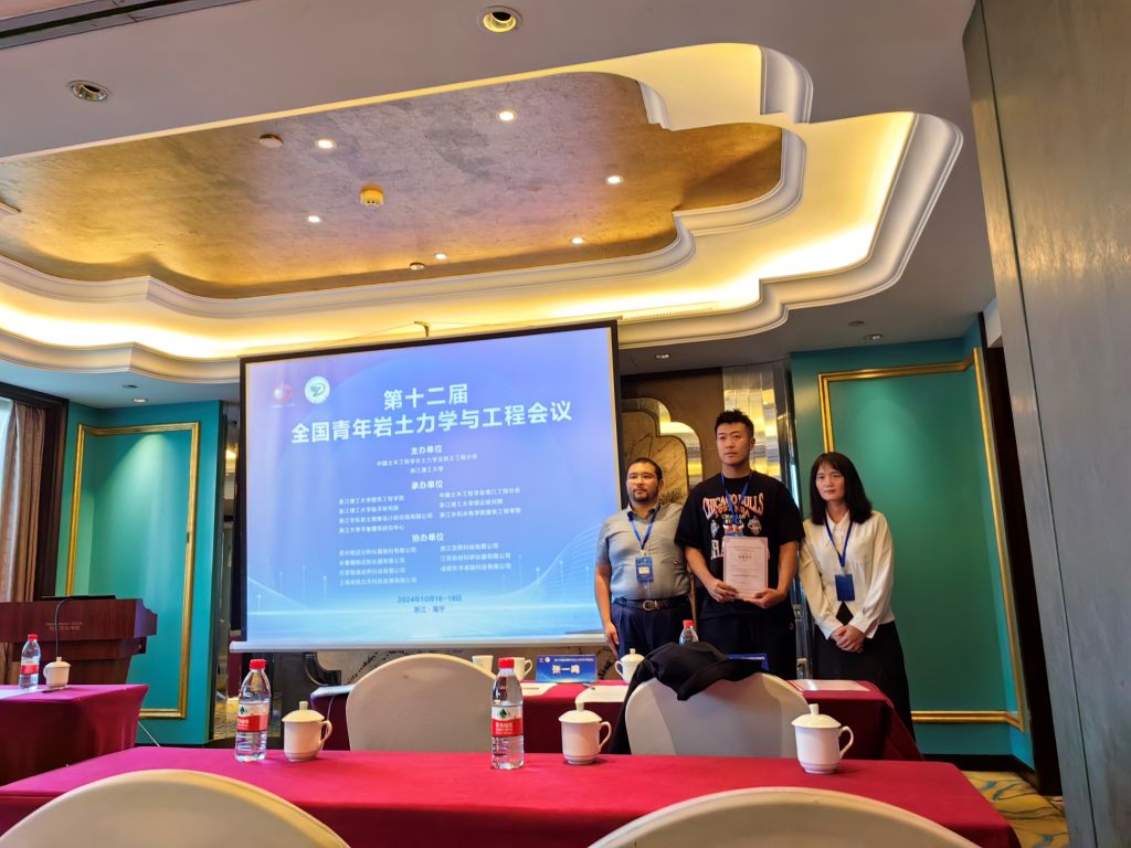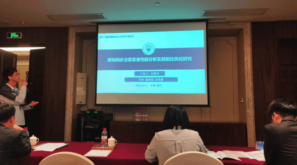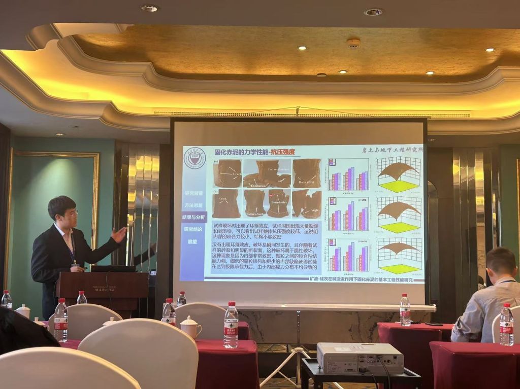 本次会议期间还举行了研究生学术报告会,旨在搭建一个专注于岩土力学与岩土工程领域的学术交流平台,鼓励研究生深入探讨岩土力学与岩土工程的前沿技术、创新应用及可持续发展路径。在报告会上,欧博abg官网岩土与地下工程研究所董晓强教授的两位博士生崔雯雯、赵晨浩和硕士生贺高乐分别作了题为“基于单纯重心法的全固废赤泥基胶凝材料设计及其水化动力学特性研究”、“盾构同步注浆浆液性能分析及其配比优化研究”和“矿渣-硅灰在碱激发作用下固化赤泥的基本工程性能研究”的学术报告。另外,岩土与地下工程研究所何斌副教授的三位硕士生刘嘉江、朱佳敏和刘克难也分别作了题为“复合絮凝-电渗-固化联合处理高含水率工程泥浆试验研究”、“CFB 粉煤灰抗硫酸盐腐蚀特性研究”和“磷酸激发铁尾矿基地聚物固化油田钻井污泥”的学术报告。
