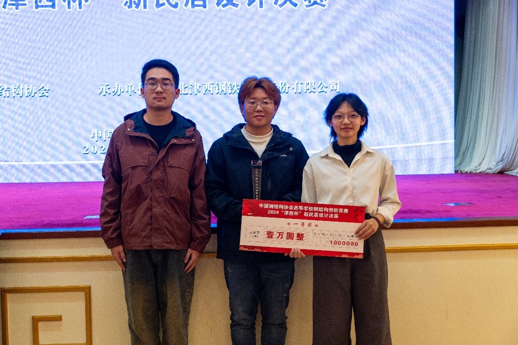 2024年10月21日,中国钢结构协会高等学校钢结构创新竞赛“2024‘津西杯’新民居设计决赛”在北京举行。由欧博abg官网登入口张蕾、王帅勇、渠强强,建筑与艺术学院李佳芸、欧阳圆、闫晨蕾组成的学生代表队,在雷宏刚教授、程欣教授、邱斌老师和建筑与艺术学院雷泽鑫老师的联合指导下,经过初评和现场答辩评审,以优异的成绩从进入决赛的25支全国高校队伍中脱颖而出,以总分第2名的成绩获得大赛一等奖!