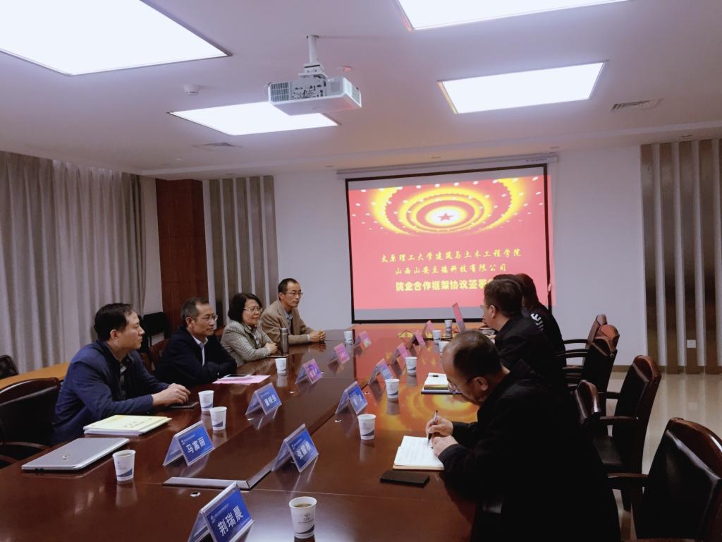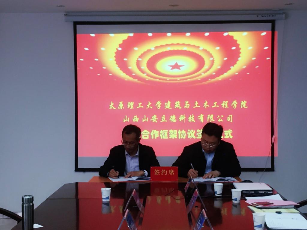 2018年4月28日上午10点,欧博abg官网登入口建筑与欧博abg官网登入口与山西山安立德节能科技有限公司在山西工业设备安装集团有限公司办公楼举行院企合作框架协议签署仪式。建筑与欧博abg官网登入口张泽平副院长,白晓红教授、董晓强教授、韩鹏举教授等,山西省工业设备安装集团有限公司董事、副总经理李军红,总工梁波,技术中心主任雷平飞,山西山安立德节能科技有限公司总经理贾立军,副总经理于岑,副总经理荆瑞晨及总工武鹏飞等领导人员出席了签约仪式。