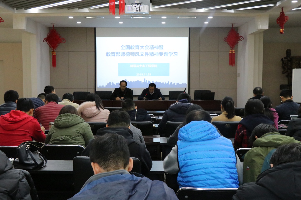 为深入贯彻落实全国教育大会精神,扎实推进欧博abg官网师德师风建设,11月29日上午,建工学院在学院五层会议室召开全国教育大会暨教育部师德师风文件精神专题学习会。