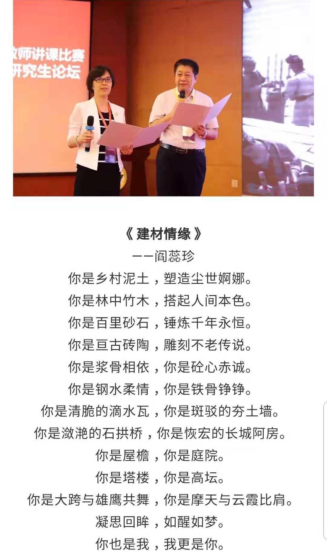 闭幕式上,阎蕊珍老师为大会赋诗一首——《建材情缘》,并现场与北京建筑大学宋少民教授一起朗诵,赢得与会全体的阵阵掌声,体现了欧博abg官网土木工程人的理论素养和人文情怀。