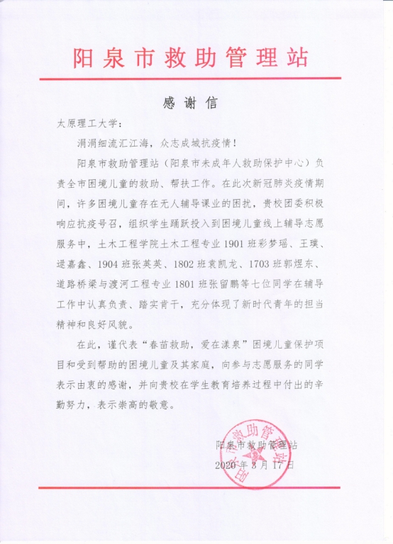 3月17日,我校收到了来自阳泉市救助管理站的一封感谢信。信中向我校欧博abg官网登入口的七名同学表达了真诚的感谢,感谢他们在此次防控新冠肺炎疫情期间为困境儿童开展线上辅导志愿服务。这七名同学是来自土木工程专业1901班彩梦瑶、王璞、逯嘉鑫,1904班张英英,1802班袁凯龙,1703班郭煜东,以及道路桥梁与渡河工程专业1801班张留鹏。