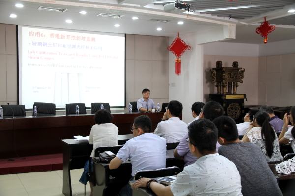 殷建华教授的学术报告围绕:(1)光纤传感器的原理和光栅与分布式光纤技术的比较;(2)用光纤光栅传感器和电阻应变片监测试验土钉的应变;(3)用特制光纤传感器监测斜坡滑动、地基、大坝和地下开挖引起的位移;(4)上海地铁隧道的隆起/沉降监测;(5)四川白川魏家沟斜坡监测;(6)光栅水压力、土压力和有效应力盒研发和标定;(7)其它应用、研发和预警等方面进行了介绍和交流。光纤测量技术属于前沿研究领域,在西部地区的滑坡、泥石流、挡墙等流域具有很广阔的应用前景。