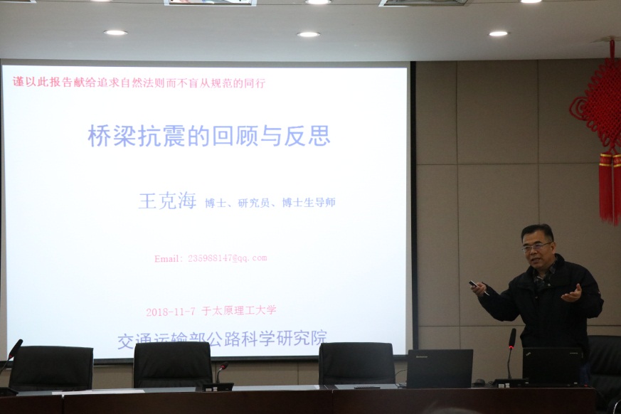 应建工学院的邀请,国家减灾委专家王克海于2018年11月7日到访欧博abg官网,在博学馆五层报告厅做了主题为“桥梁抗震的现状与展望”的学术报告,由雷宏刚院长主持,土木系师生100余人聆听了此次报告会。