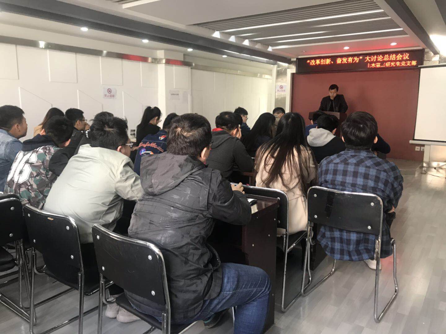为进一步贯彻落实习近平总书记有关“改革创新、奋发有为”大讨论的重要讲话,土木第三研究生党支部于2019年3月29日下午在博学馆五层岩土工程学科会议室召开“改革创新、奋发有为”大讨论工作总结会议。总结会议由支部书记何斌同志主持,共有47名同学参加,其中正式党员27名,预备党员4名,积极分子16名。