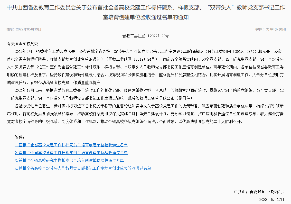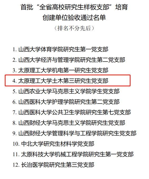 近日,山西省委教育工委公布了首批全省高校党建工作标杆院系、样板支部、“双带头人"教师党支部书记工作室培育创建单位验收通过名单。欧博abg官网土木第三研究生党支部作为我校首批9个全省党建工作培育创建单位之一顺利通过验收。