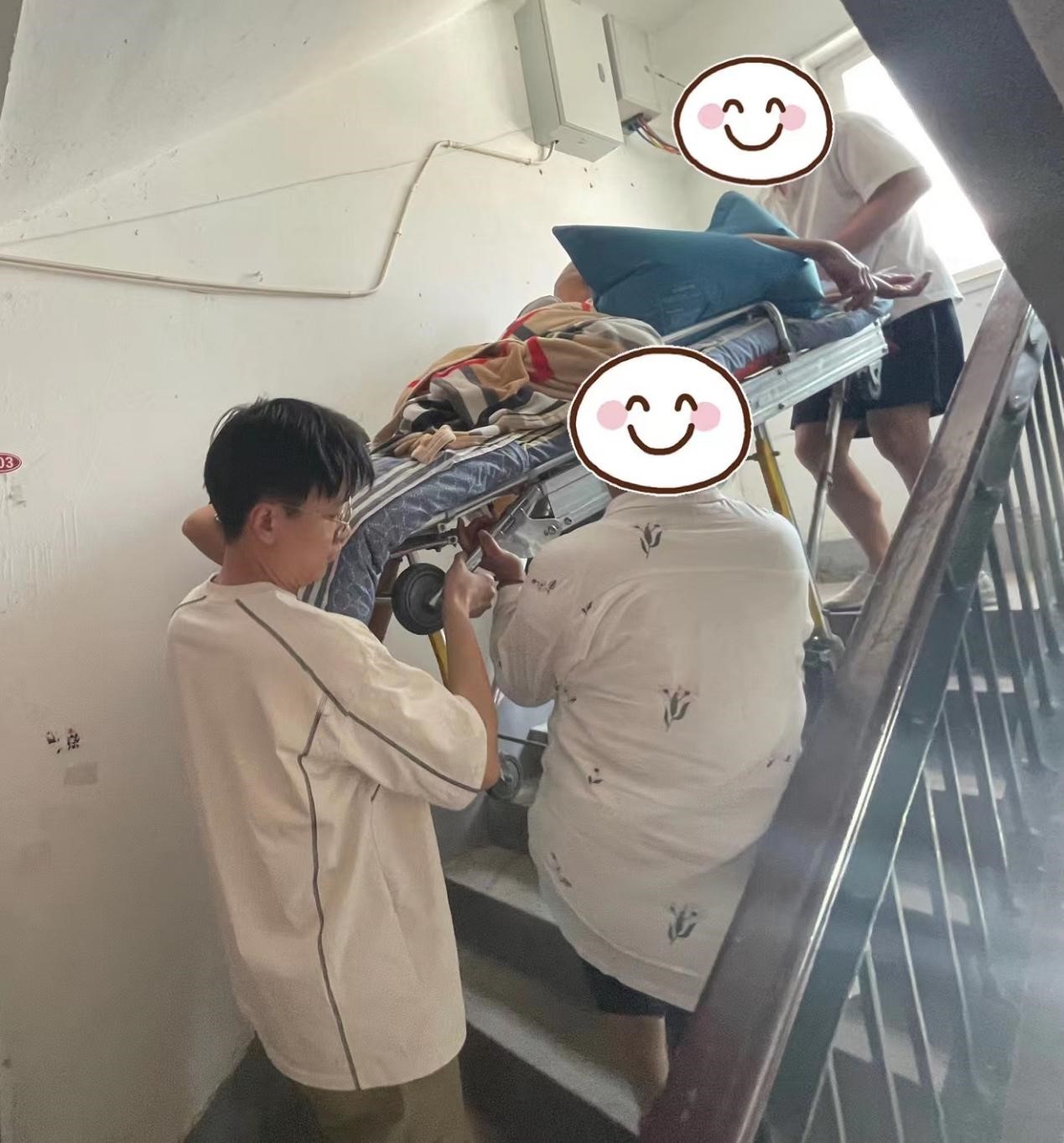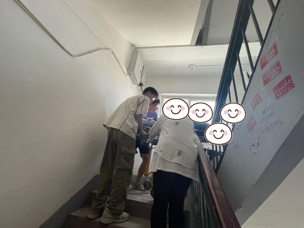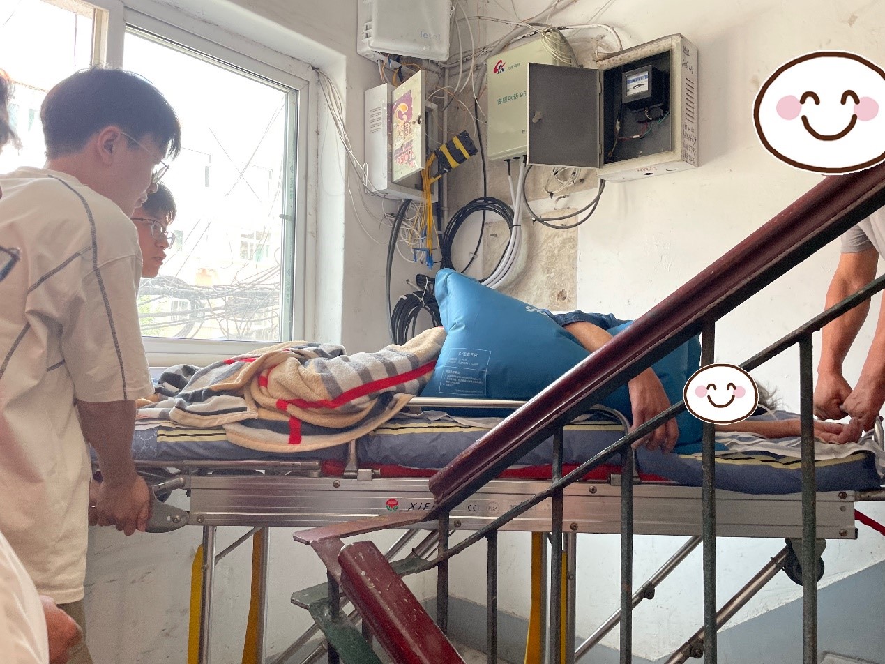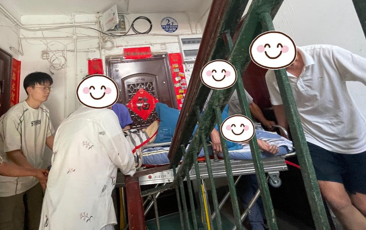 2024年6月13日中午11点半,土木第一研究生党支部书记柳丽接到一名欧博abg官网登入口教职工的求助信息,对方称其居住在欧博abg官网登入口西院住宅小区无电梯的住宅楼4楼,其家属中午12点将从医院治疗出院归来,但由于行动不便依旧卧于担架车上,而其他男性亲友有事无法前来,该名教职工及女性家属将出院家属抬上楼存在困难,所以希望能得到志愿者的帮助。柳丽同志在了解具体情况后,随即号召支部张鹏昆、曹培格、岳中华、张凯4名党员,积极承担抬担架助群众回家的“伸出援手,照亮他人”志愿服务,大家没来得及吃午饭便前往欧博abg官网登入口西院住宅小区进行帮忙。