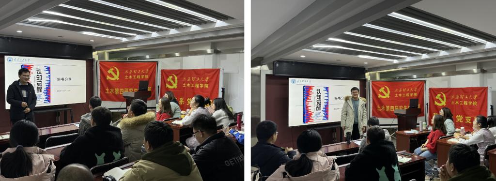 随后,土木第四研究生党支部书记邱斌就程欣书记的分享报告作了交流发言,与大家分享了自己的心路历程以及处理焦虑问题的亲身体会,并鼓励同学们化焦虑为行动,不断学习理论知识,遇到问题及时寻求老师同学帮助等。紧接着土木第四研究生党支部支委李赟对此分享学习的体会进行发言。