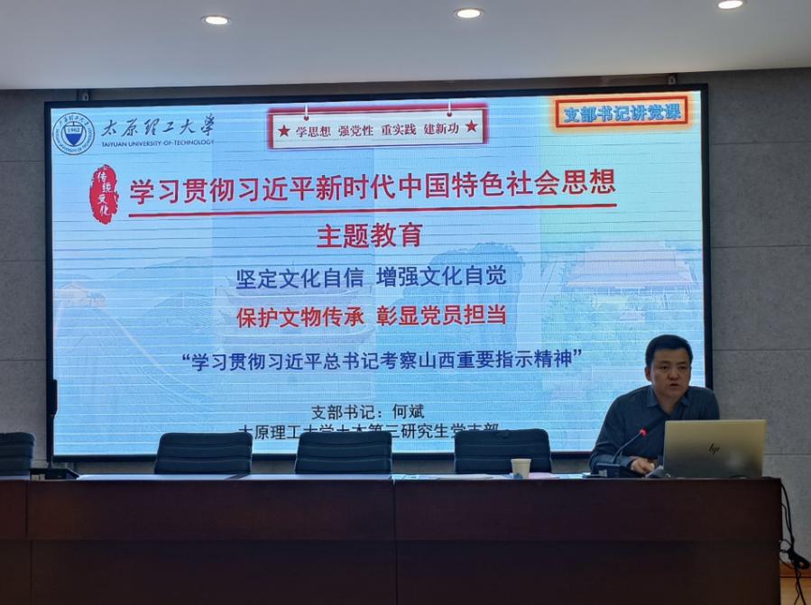 为深入开展学习贯彻习近平新时代中国特色社会主义思想主题教育和学习习近平总书记考察山西重要指示精神,2023年5月29日下午16:30土木第三研究生党支部在学院五层会议室通过现场会议的方式,支部书记何斌同志为支部全体党员讲授“坚定文化自信 增强文化自觉 保护文物传承 彰显党员担当”主题党课。